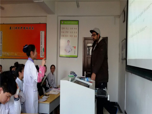 我校涉外護(hù)理專業(yè)一直有聘請外籍教師為學(xué)生們強(qiáng)化口語的傳統(tǒng),去年更是優(yōu)中選優(yōu)的從哈爾濱醫(yī)科大學(xué)聘請了來自美國加利福尼亞的Perry老師。他不僅能交會(huì)學(xué)生生活英語,更重要的是還能在涉外護(hù)理方面給學(xué)生們提供更多的幫助。在他的幫助下,同學(xué)們開始勇于表達(dá)自己,迅速和陌生人交流互動(dòng)的能力得到了顯著的提高。